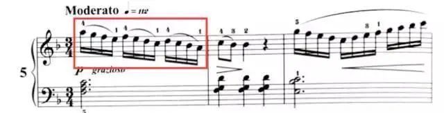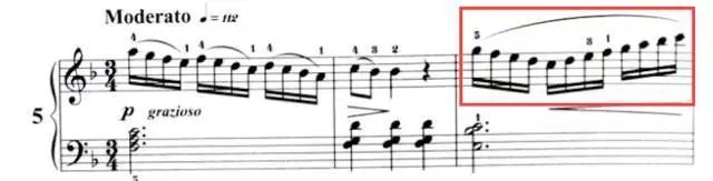 在第五小节中,杨老师特意强调了右手3指在演奏过程中的变换。我们需按照琴谱上的指法标记来变换指法,完成这一乐句的演奏。